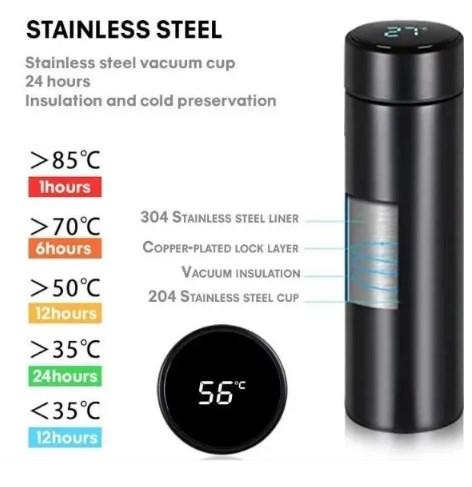 Найголовніше те, що термос має світлодіодний екран, на якому відображається температура вмісту. Ефективний аксесуар підтримує температуру напоїв до 12 годин, ідеально підходить для зберігання чаю, кави, соку, води.