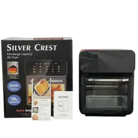 Мультипіч із обдуванням Silver Crest – це сучасний пристрій 2 в 1, що поєднує функції аерогрилю та фритюрниці без олії, що дозволяє готувати смачні та корисні страви без зайвого жиру. Завдяки високій потужності 2400 Вт та об'єму 15 літрів ви зможете швидко приготувати їжу на всю родину – від хрустких картопляних часточок до ароматної курки-гриль. Конвекційне нагрівання зверху за допомогою ТЕНу забезпечує рівномірну термічну обробку, а терморегулятор та сенсорне керування з 10 автоматичними програмами роблять процес приготування неймовірно простим та зручним. Максимальна температура нагрівання досягає 200°C, є вбудований таймер, а довжина шнура мережевого 1 м дозволяє комфортно розмістити пристрій на кухні. Стильний чорний корпус і компактні розміри (34х28х31 см) роблять мультипіч не тільки функціональною, але і ефектним доповненням інтер'єру.
