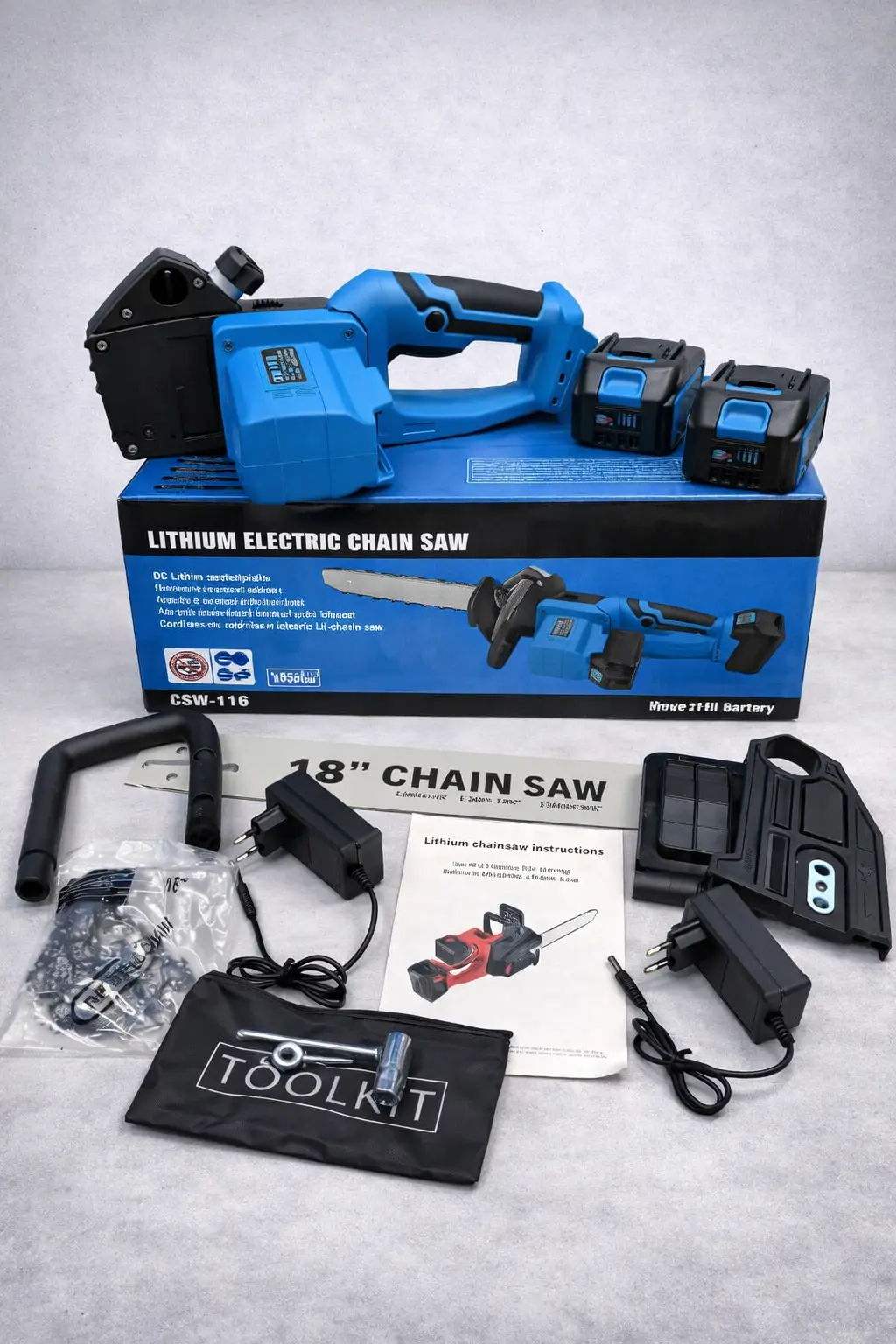 Акумуляторна безщіткова ланцюгова пилка 18 дюймів 45 см, 2 АКБ, 2 зарядні пристрої BLUE