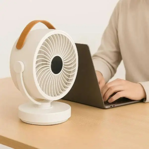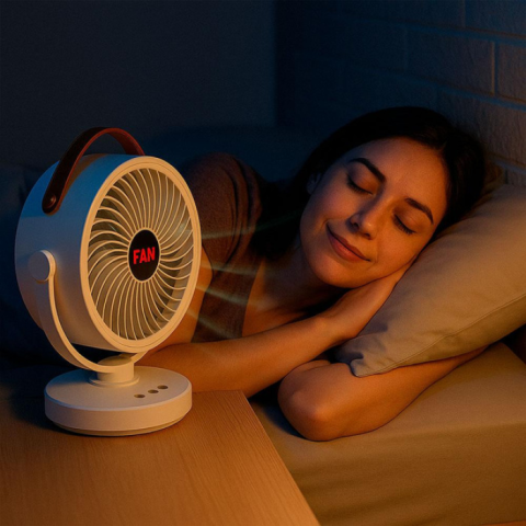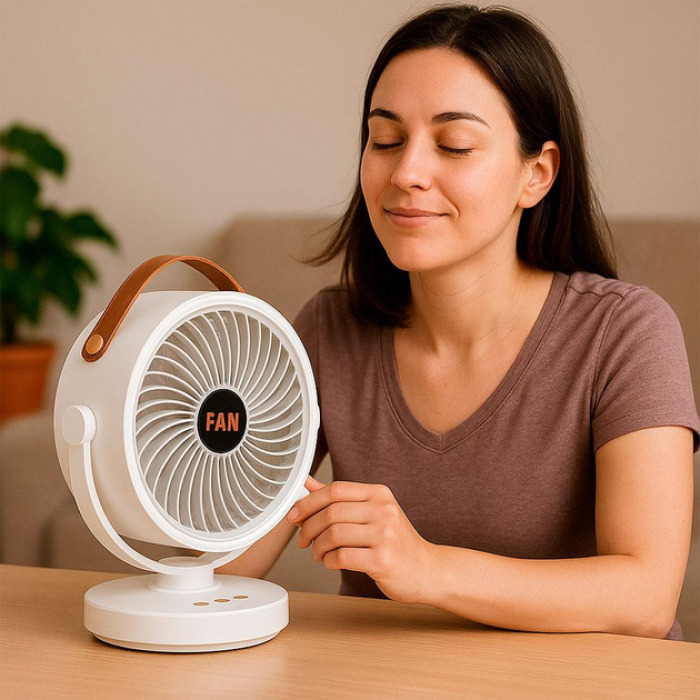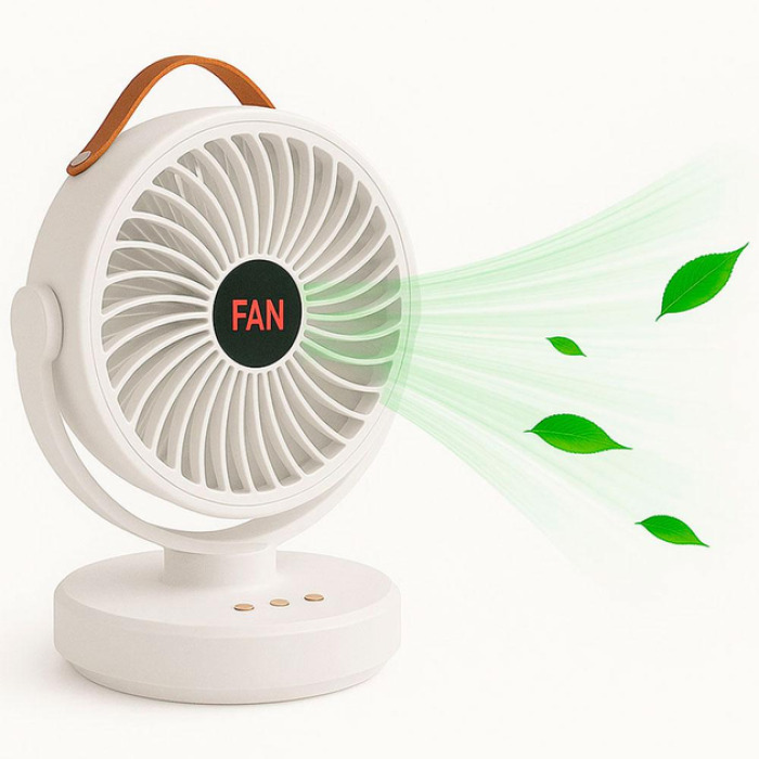 Легкий та компактний вентилятор з регулюванням нахилу та повороту корпусу. Працює до 8 годин від вбудованого акумулятора – не потрібна розетка. Заряджається через USB, що дозволяє підключати його до ноутбука, павербанку або адаптера. Ідеально підходить для дому, подорожей, кемпінгу чи офісу.