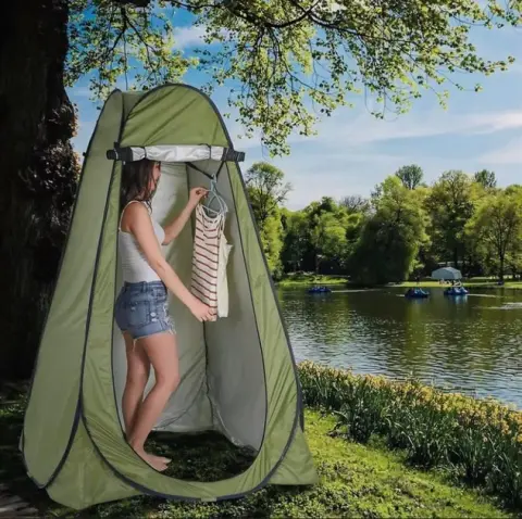 Зовні намет з вікном на блискавці і великими дверима виготовлений з водостійкого матеріалу Oxford, всередині автоматичний намет душ-туалет оснащений покриттям, що тепловідбиває.