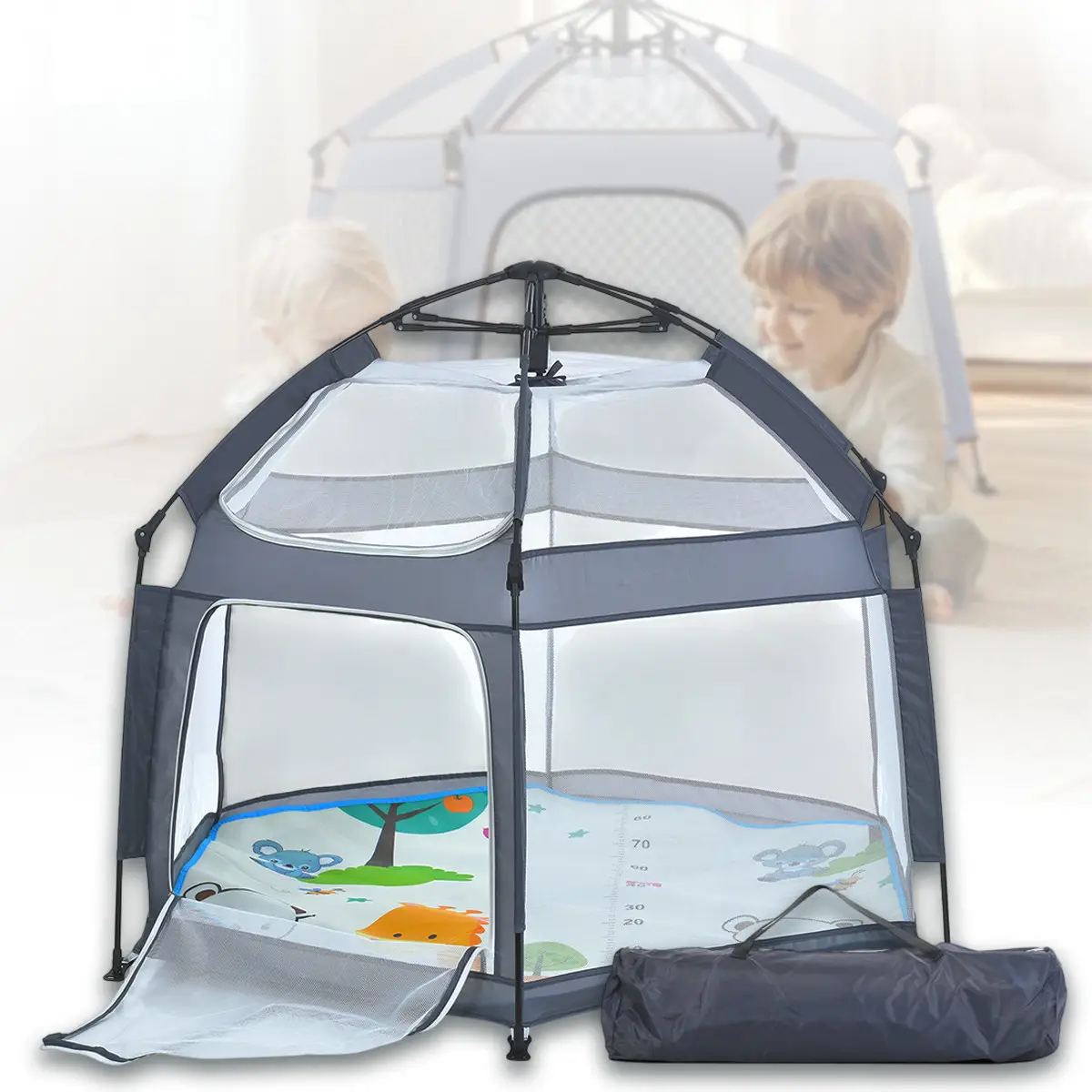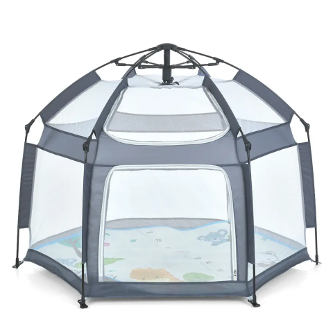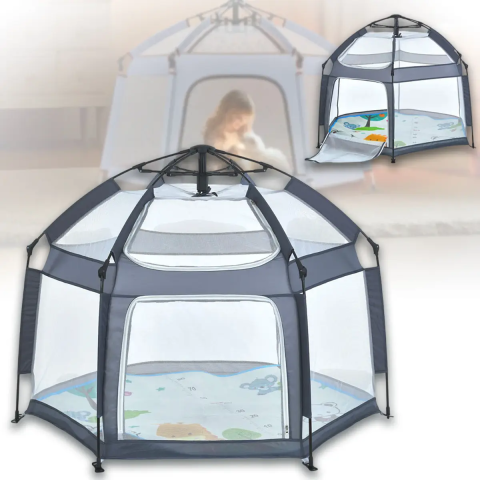Зручна конструкція розміром 146x127x110 см забезпечує достатньо місця для ігор, повзання та відпочинку. Всі стіни виконані з сітки, що дихає, що гарантує відмінну вентиляцію і повний огляд з усіх боків. Широкий вхід на блискавці дозволяє малюкові самостійно заходити та виходити.