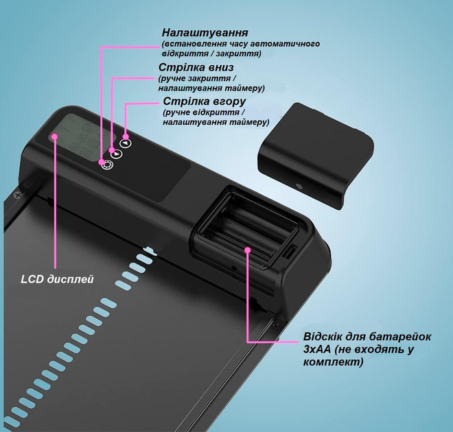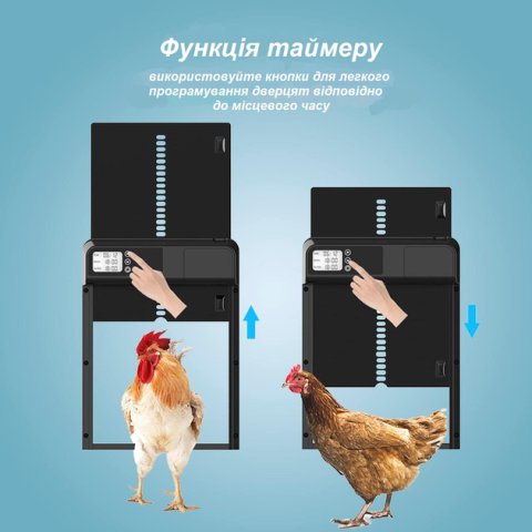 Використовуйте кнопки для легкого програмування. Час відчинення та закриття дверцят можна встановити за місцевим часом за допомогою 24-годинного годинника.