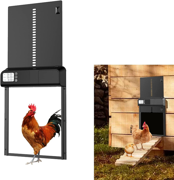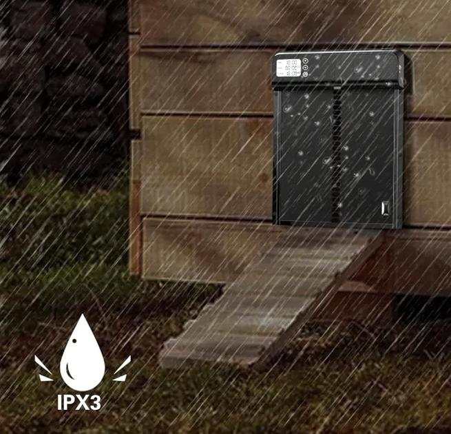 Коли вбудований датчик виявить курку під дверима, автоматичні дверцята зупиниться.