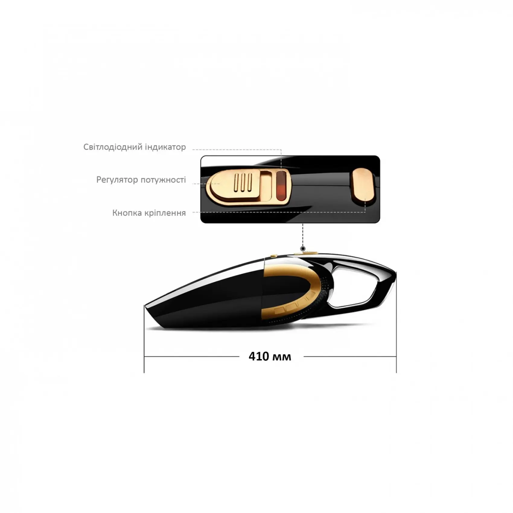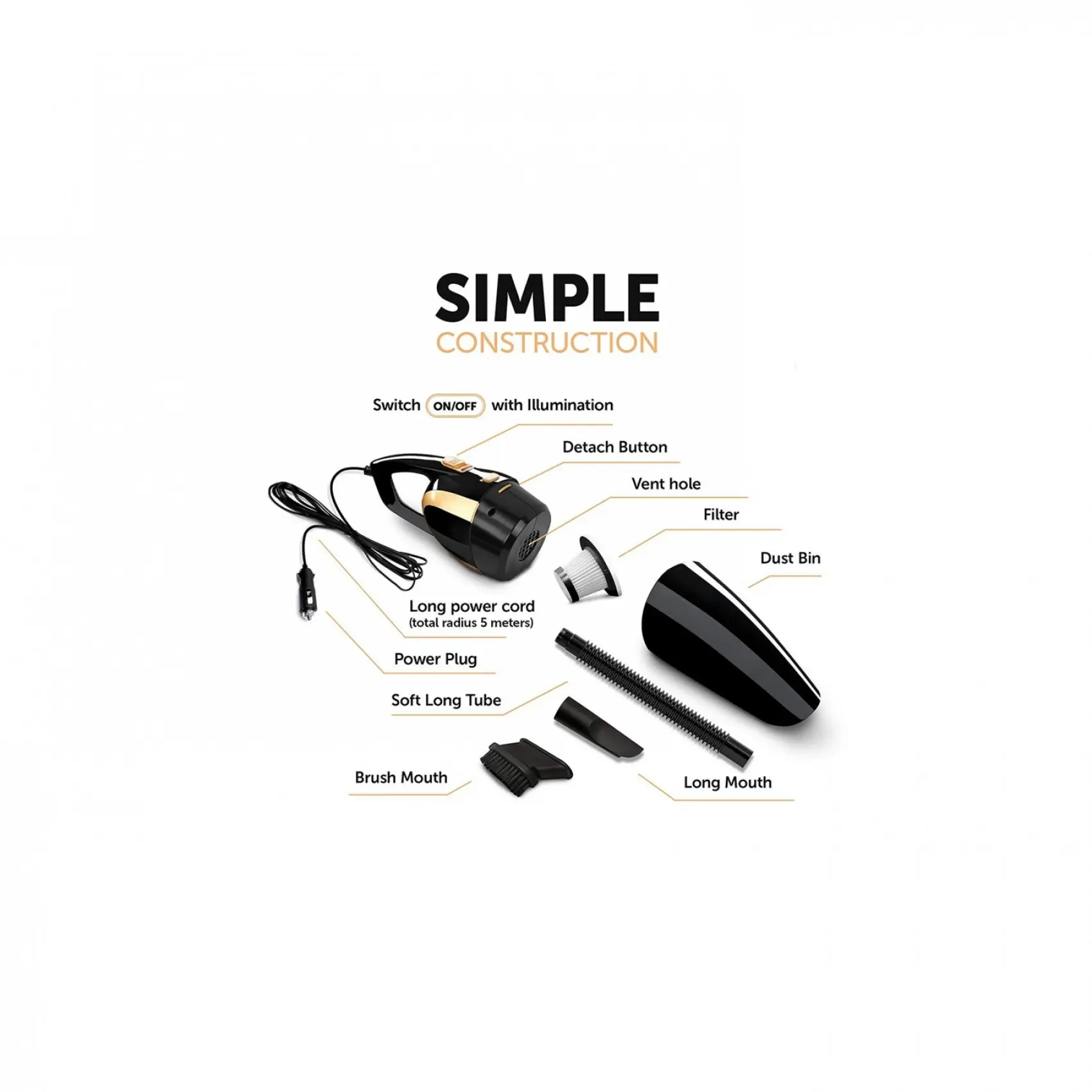 Виконаний із міцного ABS пластику, що особливо важливо в умовах інтенсивної експлуатації. Час безперервної роботи пилососа складає до 25 хвилин, за цей час можна впоратися зі збиранням автомобіля будь-якого розміру. Живлення пилососа походить від бортової електромережі 12В через прикурювач або від вбудованої батареї Li-ion 7500mah. Для зручності зберігання та експлуатації пилосос комплектується кабелем, що від'єднується, довжиною 3 м.