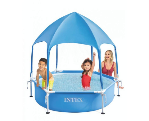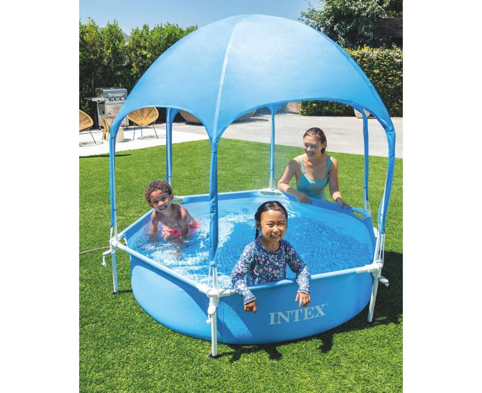 Основна особливість даного басейну – це комплектація басейну високим зонтом тенту, під яким можна купатися.