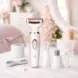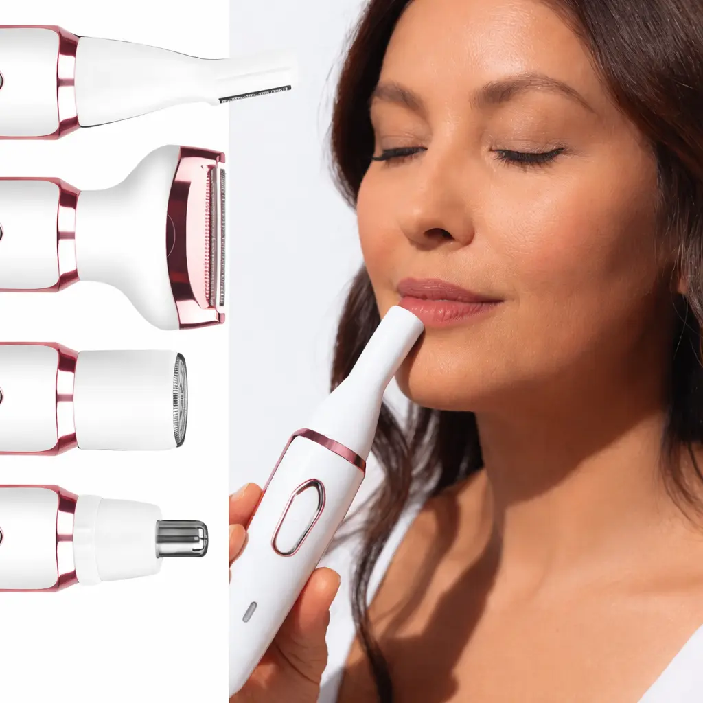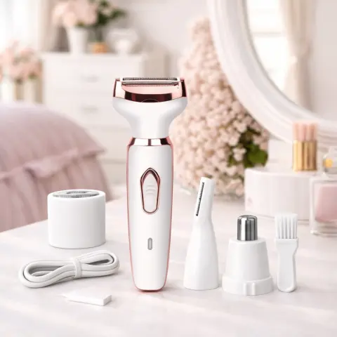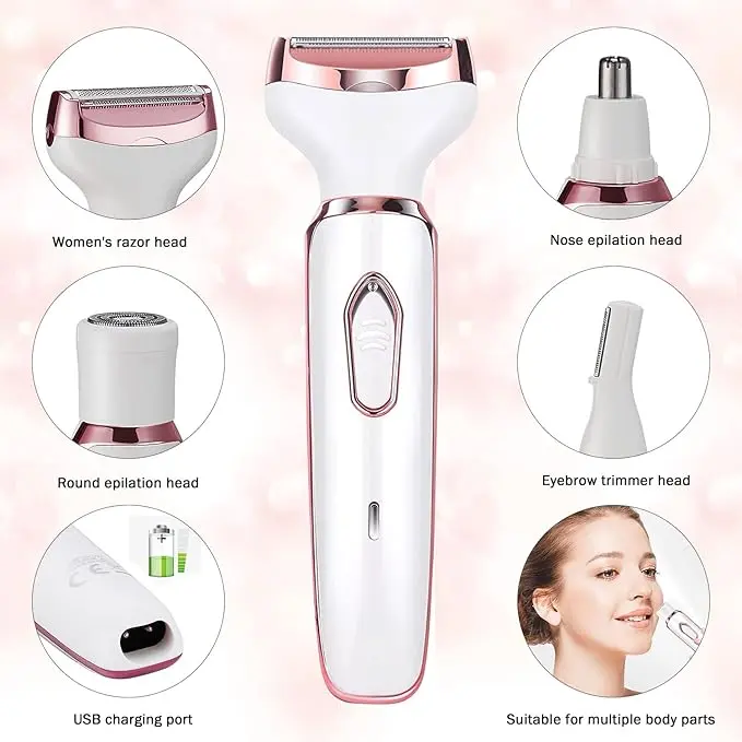Набір електробритви 4-в-1 для жінок включає 4 багатофункціональні насадки для миттєвого видалення волосся з обличчя, рук, ніг, зони бікіні, носа, брів і т. д., забезпечуючи повне видалення волосся і роблячи шкіру більш гладкою.