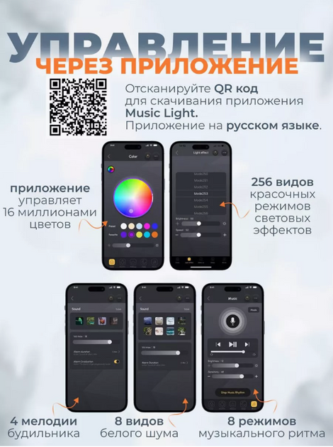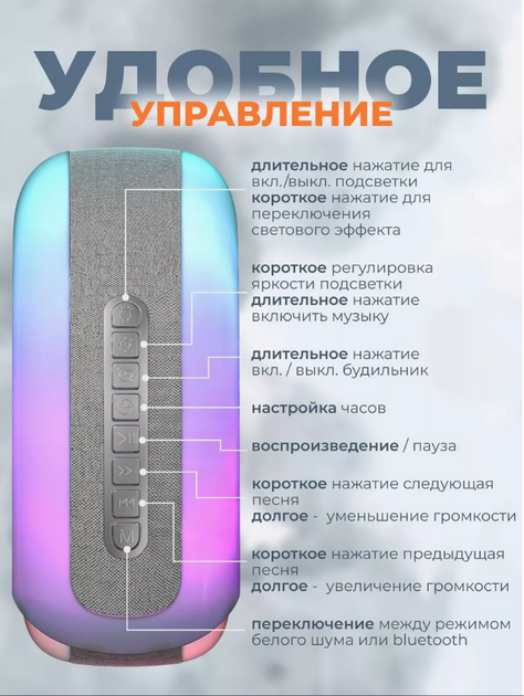 Особливості: будильник, світлові ефекти, нічник, вісім видів білого шуму.