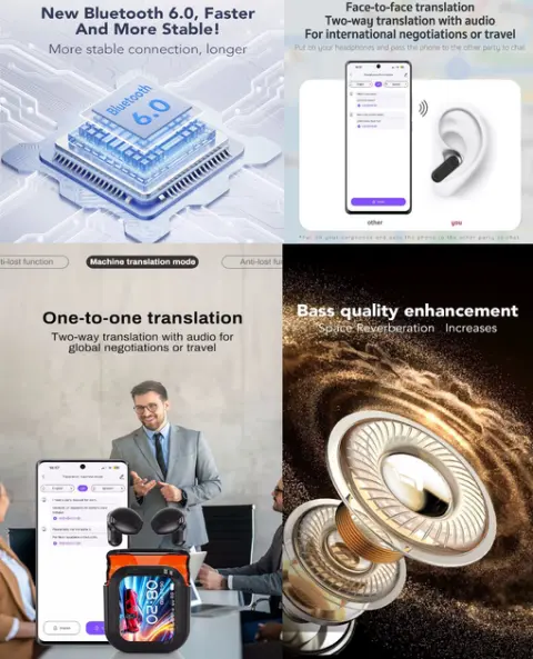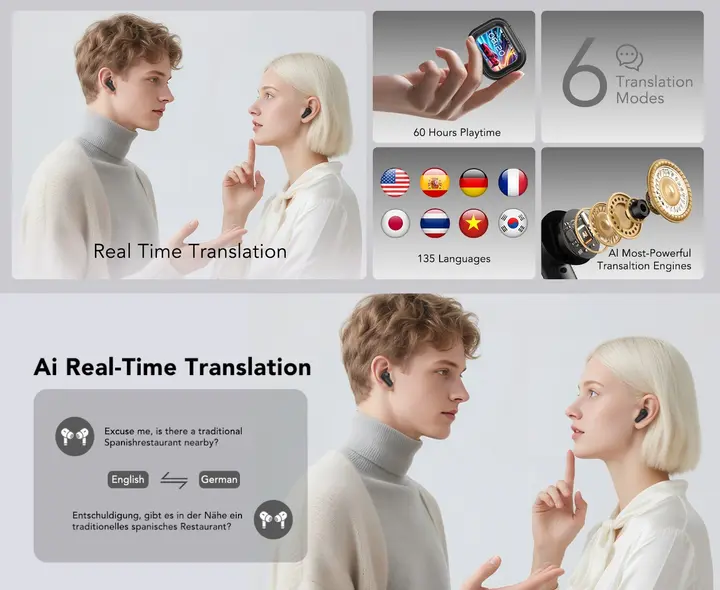 134 мови Підтримує 134 мови з точністю перекладу понад 99%, що забезпечує безперебійне спілкування з людьми у всьому світі. Незалежно від того, перекладаєте ви з поширених мов або більш вузьких, він забезпечує швидкі та точні результати перекладу. Він також дозволяє двом користувачам носити по одному навушнику для переведення в режимі реального часу, що робить його ідеальним для ділових розмов або розмов у подорожах.
