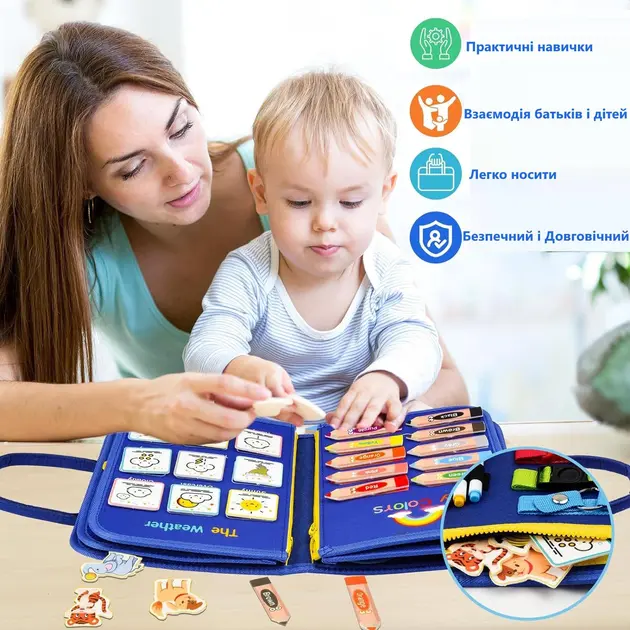 Бізіборд включає 2 сторінки для розвитку дрібної моторики з пряжками, блискавками, шнурками та ременями, 8 сторінок навчальних занять для дошкільнят, включаючи малювання, алфавіт, форми та кольори, а також 2 сторінки елементів космічного простору для натхнення вашої уяви, цей сортер малюка.