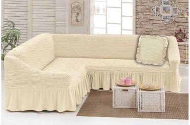 Бежевий Турецька накидка на кутовий диван з оборкою, натяжний чохол на диван