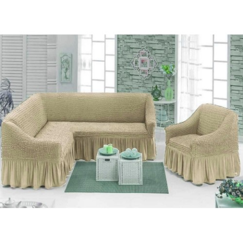 Песочний Чохол накидка на кутовий диван з кріслом, комплект чохлів на кутовий диван та крісло з оборкою Туреччина
