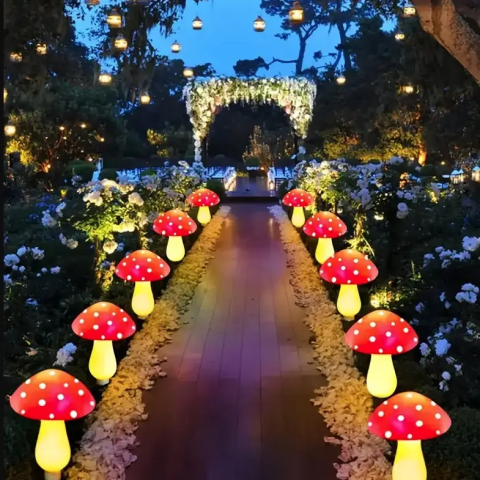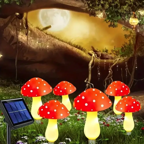 Яскрава гірлянда у вигляді мухомору стане оригінальною окрасою саду, двору, тераси чи святкової зони.