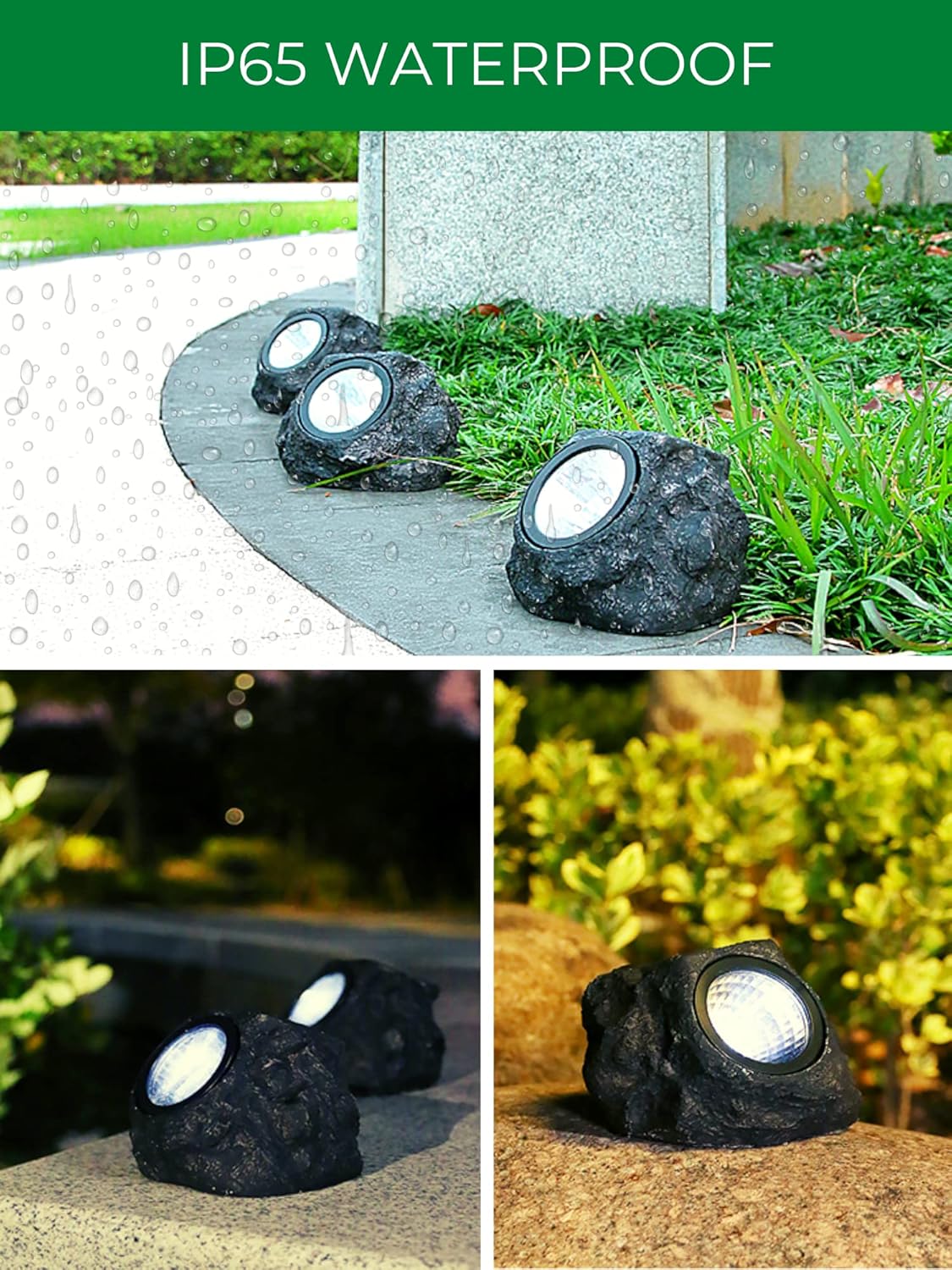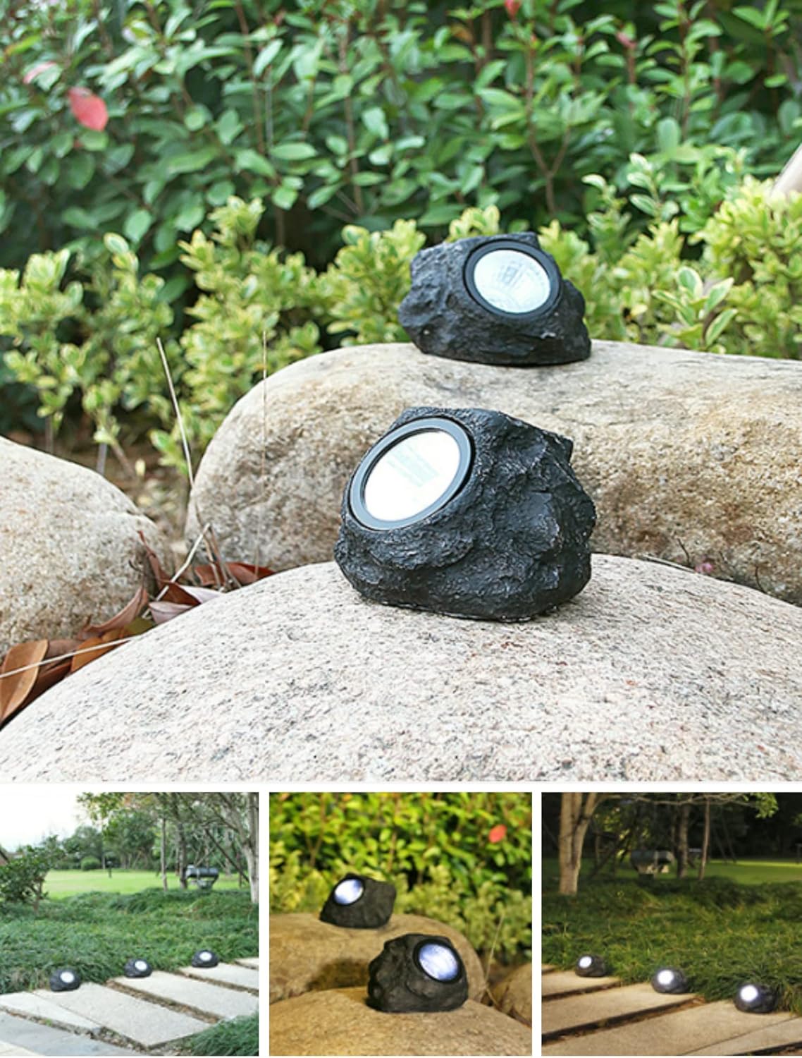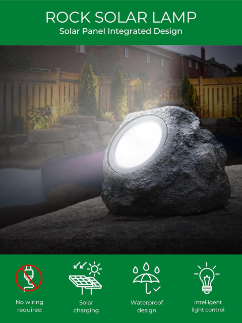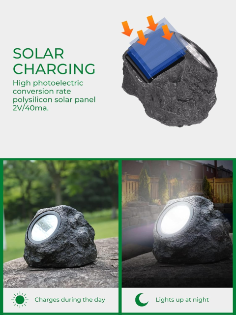 Сонячний світильник з 4 світлодіодами, що точно імітує камінь естетичним дизайном, ідеально впишеться у ваш сад, патіо, доріжку, газон або будь-яке інше місце на відкритому повітрі, яке ви хочете висвітлити. У комплекті 2 сонячні світильники у формі каменю.