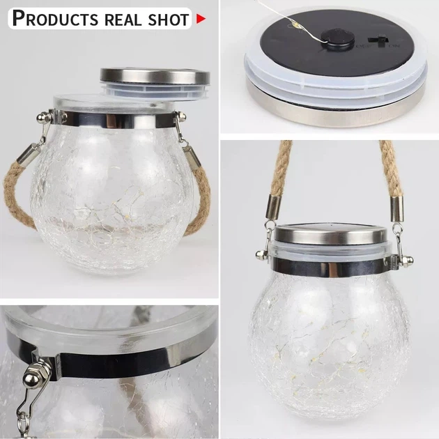 Корпус у формі пляшки виготовлений з товстого прозорого скла з ефектом крижаної крихти, що випромінює м'яке світло та чудовою текстурою. Декоративні світильники, створені своїми руками, мають унікальний та інноваційний дизайн, а сонячні ліхтарі створять затишну атмосферу. За допомогою прядивної мотузки, що додається, ви можете легко повісити сонячний садовий світильник на стіну, в саду, на дах або дерево, або розмістити його на столі, полиці або балконі.