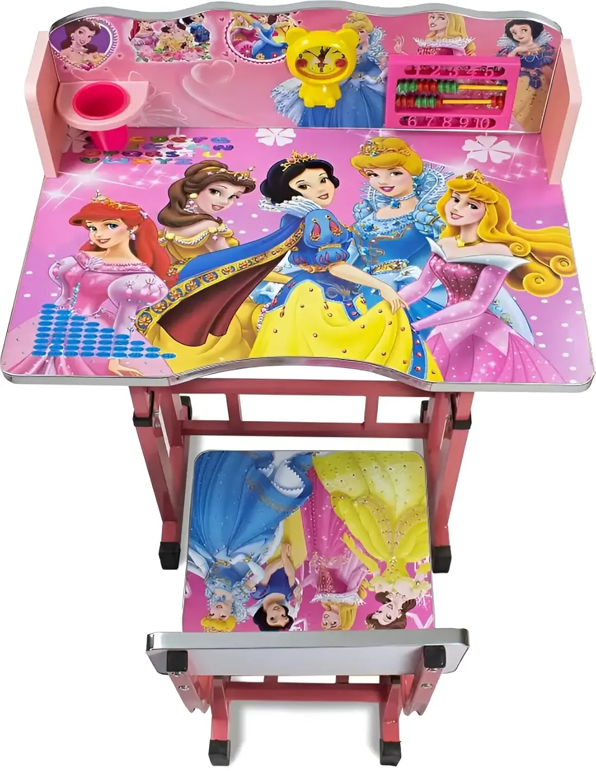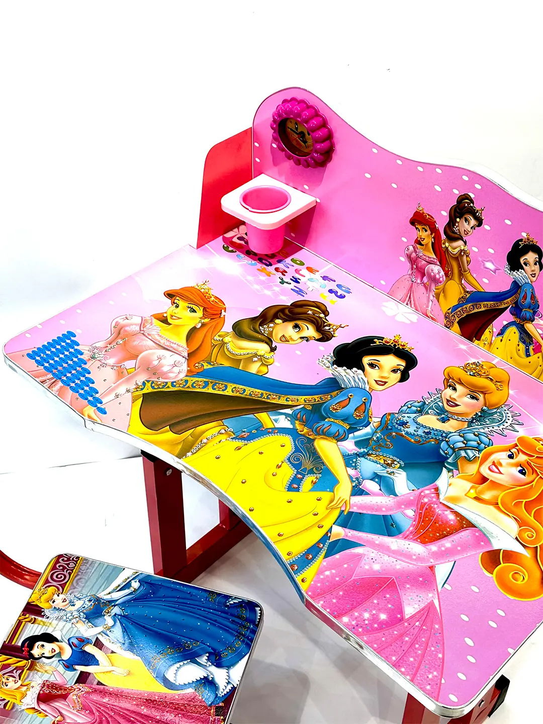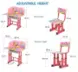 Робочий стіл або письмовий стіл для дитини – це те, що вам потрібно, щоб дитина могла комфортно робити домашнє завдання, малювати чи займатися творчістю. Модель виконана з міцної та легкої конструкції, має можливість регулювання висоти. Вбудований годинник та підставка для пензлів забезпечують додаткову зручність, а під стільницею є ще одна полиця, на яку можна покласти білі аркуші паперу або інше приладдя для малювання та розмальовки.