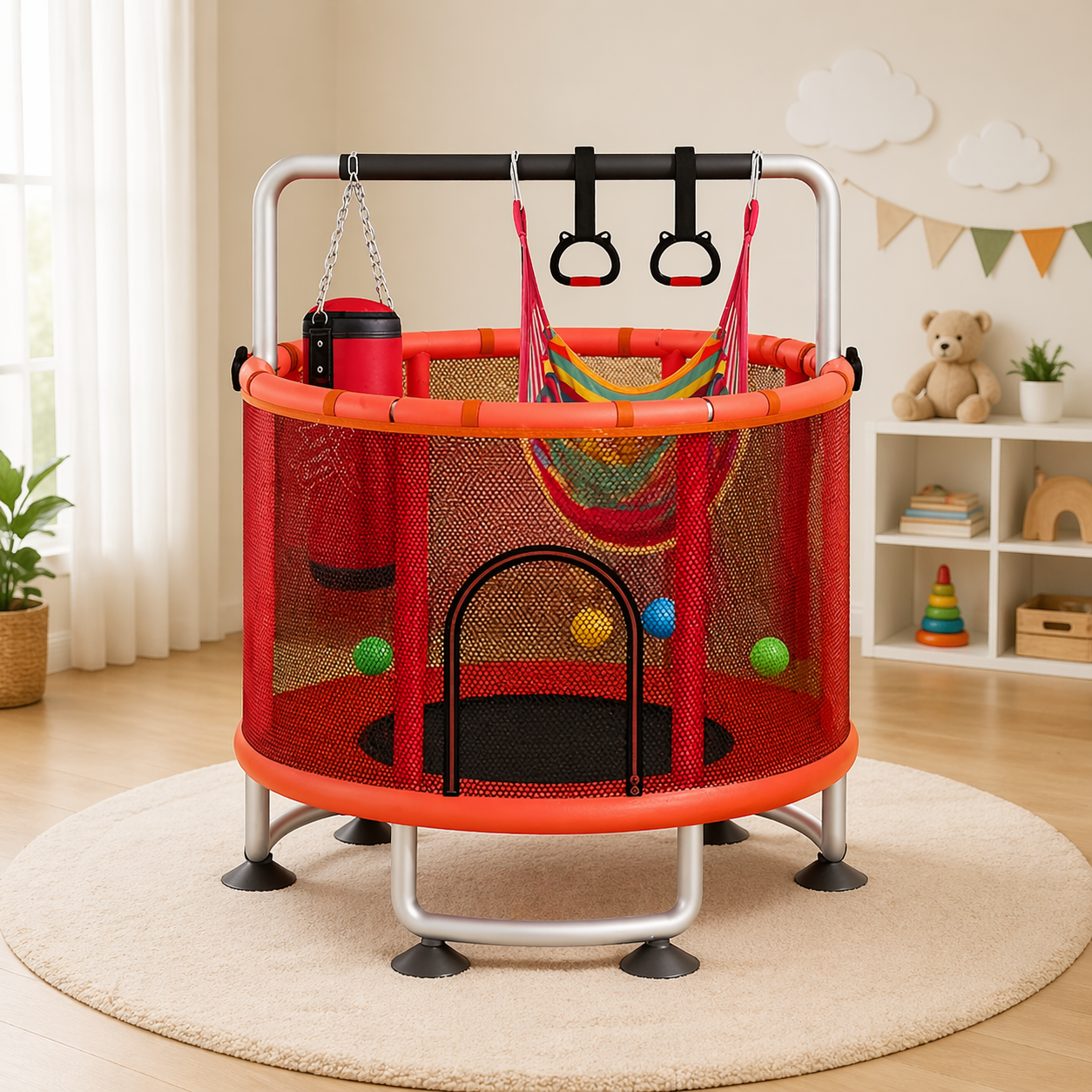 Ідеальне рішення для активного та всебічного розвитку дитини вдома. Цей ігровий центр поєднує відразу кілька популярних елементів, перетворюючи звичайні заняття на захоплюючу та корисну активність. Дитина зможе стрибати, тренуватися, відпочивати та грати – все в одному безпечному просторі.