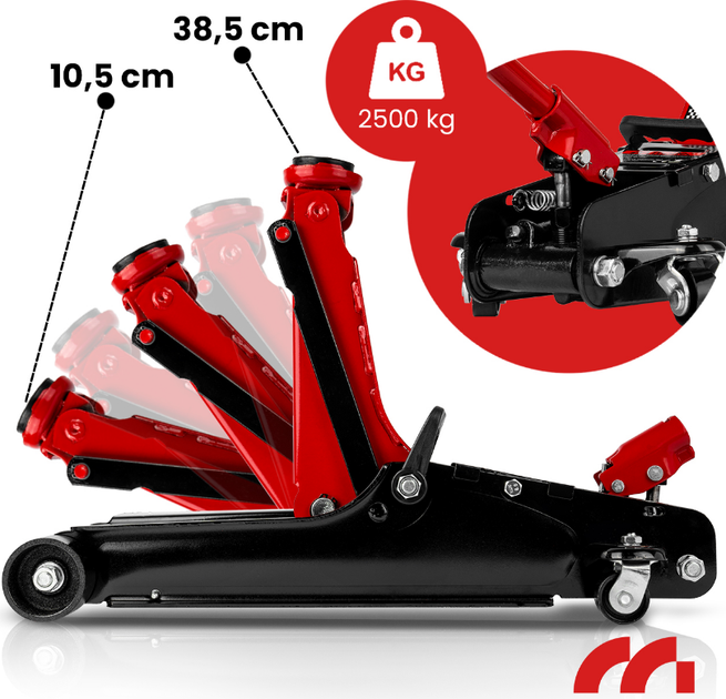 Низький профіль дизайну дозволяє домкрату прослизати під автомобілями з низькою підвіскою.