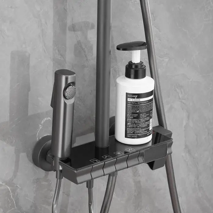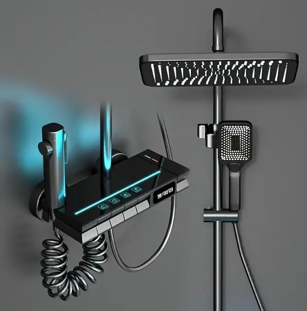Основне керування душем відбувається за допомогою чотирьох інтуїтивних клавіш, кожна з яких активує потрібний вам душ у потрібному режимі. Ви можете використовувати три режими ручної душ, ванну кімнату, гігієнічний душ та верхній душ. Душова система оснащена дуже гарним підсвічуванням та цифровим дисплеєм, що відображає температуру води та час початку запуску води, що забезпечує повний контроль над процесом.
