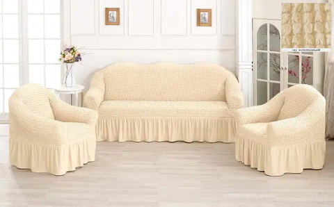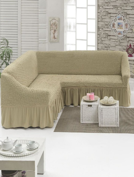Кремовий Турецька накидка на кутовий диван з оборкою, натяжний чохол на диван