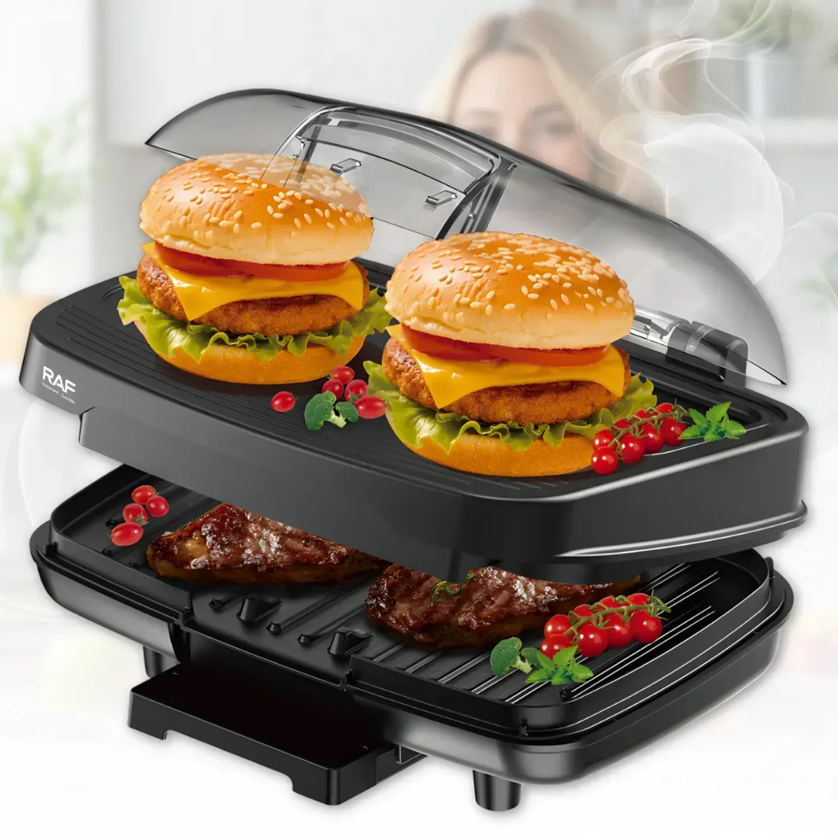 Прилад підходить не тільки для приготування бургерів, а й для стейків, сендвічів, овочів та інших страв на грилі. Подвійні антипригарні пластини рівномірно розподіляють тепло, скорочуючи час приготування та забезпечуючи стабільний результат. Бургерниця проста у використанні, швидко нагрівається та легко очищається після використання, що робить її практичним рішенням для повсякденного застосування.