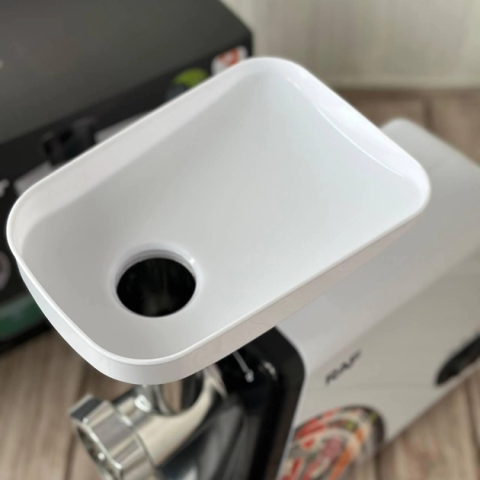 Пристрій має функції захисту від перегріву та реверс. У комплектацію входять грати для фаршу, насадка для ковбас. Система двигуна сама контролюватиме свою роботу і попереджатиме можливе навантаження або перегрів, що забезпечує довговічність приладу та мінімізацію його поломки.