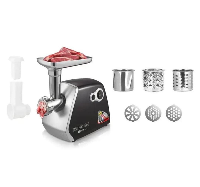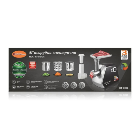 BITEK BT-3400 - М'ясорубка з електричним приводом, яка має функцію реверсу та в комплекті з насадками для приготування ковбаси та страви "Кеббе", має потужність 3500 Вт. Вона легко справляється з подрібненням м'яса, риби, грибів та формуванням ковбасок. При цьому вона відрізняється низьким рівнем шуму під час роботи.