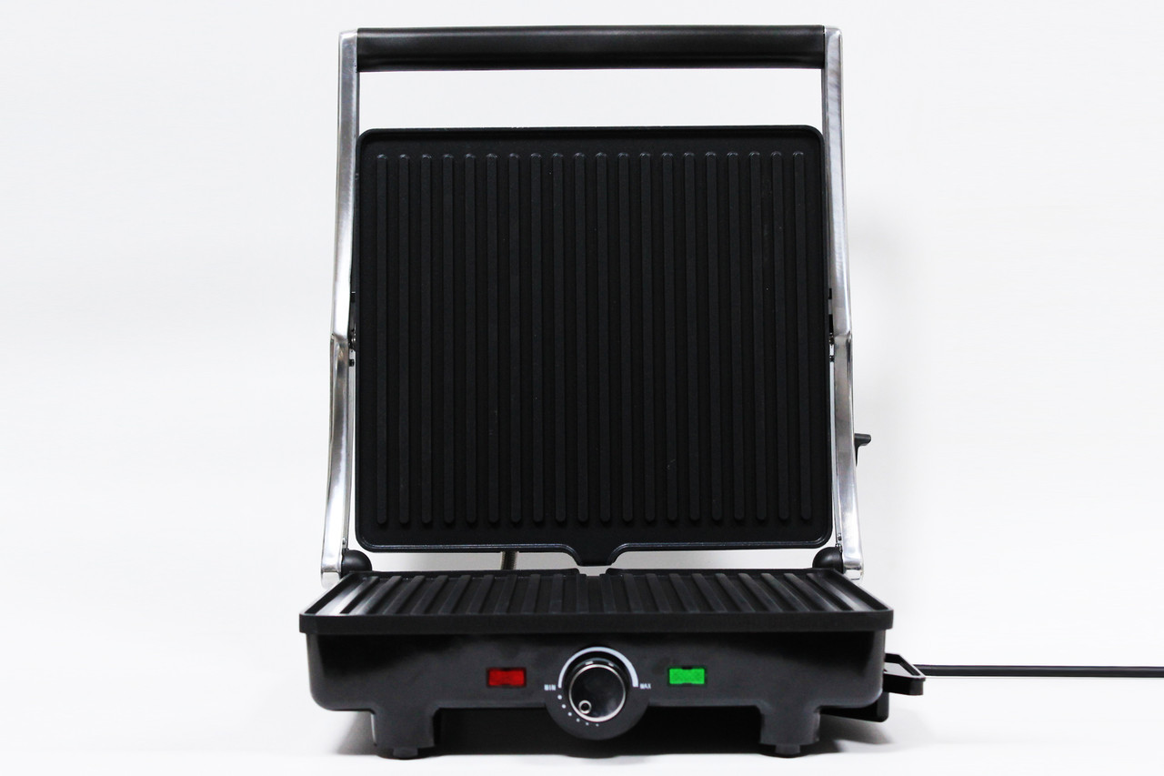 Пластини електрогриля виконані з безпечного та якісного матеріалу - нержавіючої сталі, а корпус - із пластику та металу. Покриті антипригарним покриттям, що дозволяє готувати продукти без додаткового додавання олії та жиру на поверхню для смаження. Рифлена поверхня пластин надає стравам апетитного піджаристого вигляду. Користувач не пошкодить руки, торкаючись ручки, адже вона оснащена теплоізоляцією, а прогумовані ніжки не дадуть грилю ковзати по столу. Потужність цієї моделі складає 3200 Вт, тому їжа готується в ньому досить швидко. Прилад також використовується як сендвічниця, яка здатна швидко і легко приготувати гарячі бутерброди. Вт;