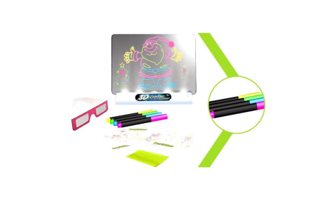 Сам набір складається з дошки для малювання, 4 кольорових фломастерів, 3D-окулярів і 3 кольорових картинок. До речі, всі малюнки з дошки легко стираються звичайною тканиною. Цей творчий набір для малювання здатний захопити будь-яку дитину і буде прекрасним подарунком для неї.