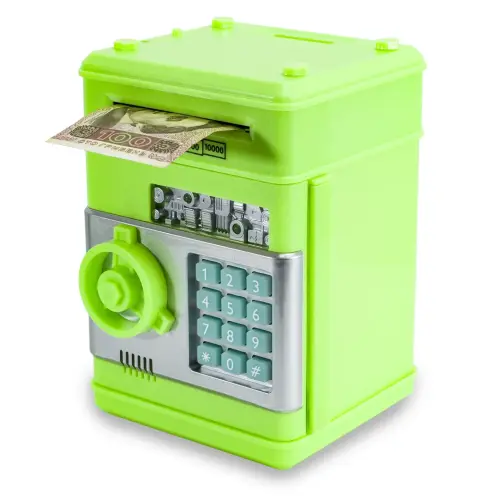 Ця електронна скарбничка-сейф стане чудовим подарунком будь-якій людині, яка хоче трохи підкопити і залишити це в секреті. Дана скарбничка-сейф оснащена спеціальним механізмом, який спрацьовує при піднесенні купюри до купюроприймача і затягує її всередину, поміщаючи в основне відділення скарбнички. У верхній частині є проріз для монет, які збираються в спеціальний лоток і не змішуються з купюрами.