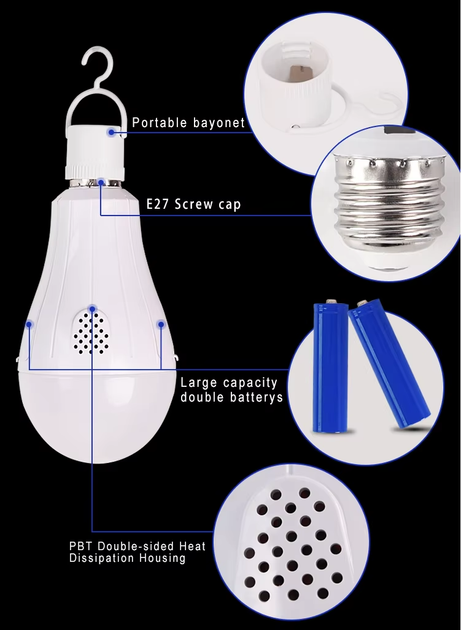 Ефективність: Споживана потужність становить 20 Вт, а світловий потік сягає 1500 лм (залежить від заряду акумуляторів). Лампочка має білий пластиковий корпус.