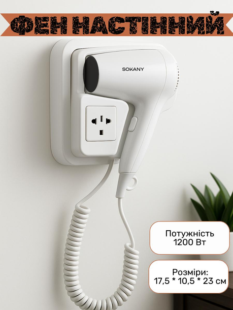 Мережевий настінний фен Sokany SK‑CF‑2217 – компактний та надійний прилад для швидкого сушіння волосся. Завдяки настінному кріпленню економить простір у ванній кімнаті або у готельному номері. Потужність 1200 Вт забезпечує ефективний потік повітря, а шнур-спіраль робить зручним та безпечним.