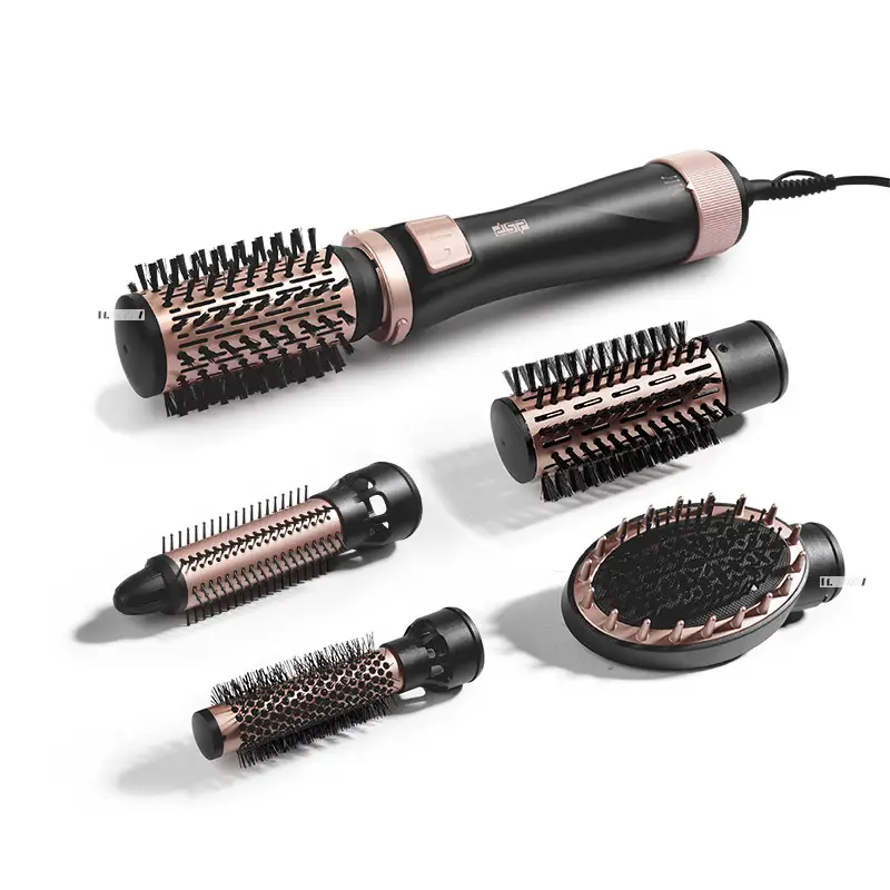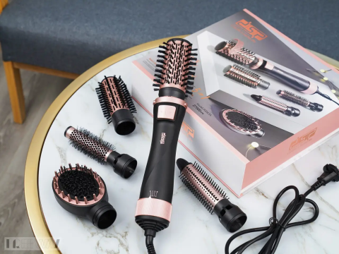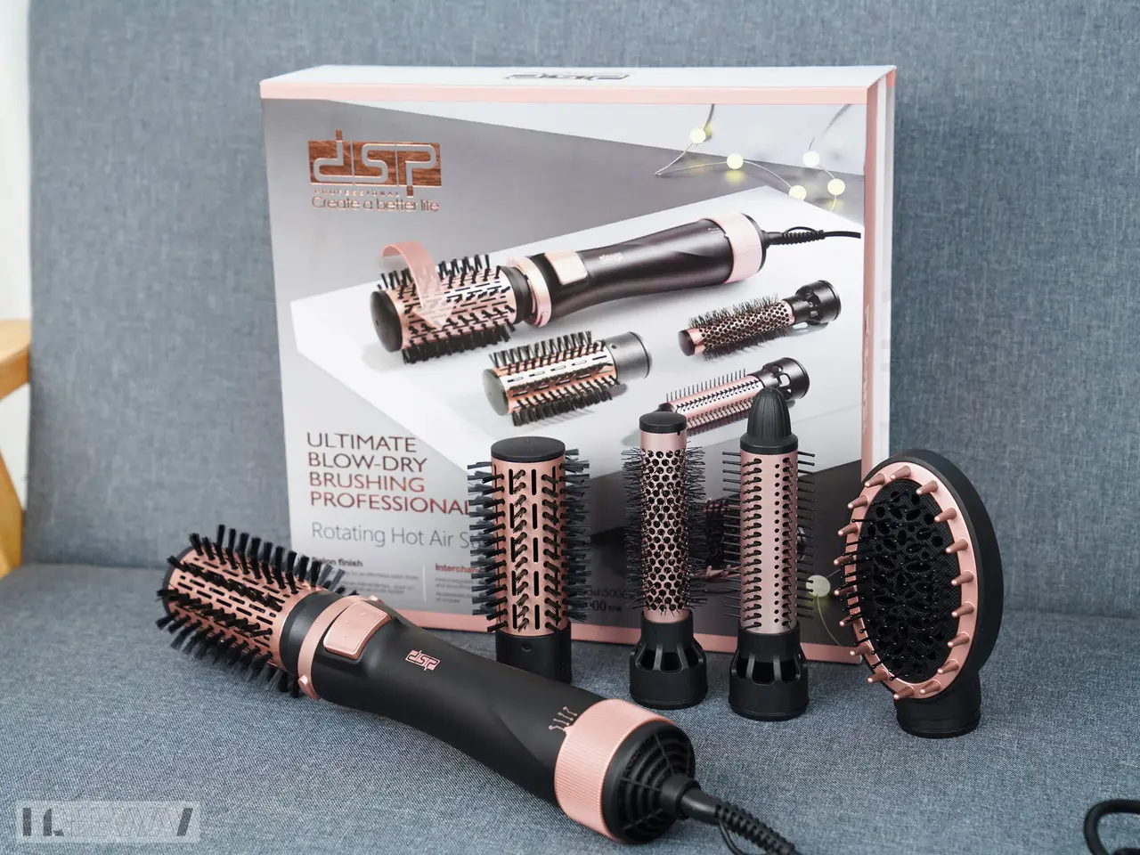 Фен щітка для волосся з щіткою, що обертається (крутиться) з насадками для укладання волосся 5в1 DSP 1000W (50063A) - оснащена п'ятьма змінними насадками-щітками, які дозволяють з легкістю виконувати випрямлення, завивку, збільшення об'єму і масаж шкіри голови.