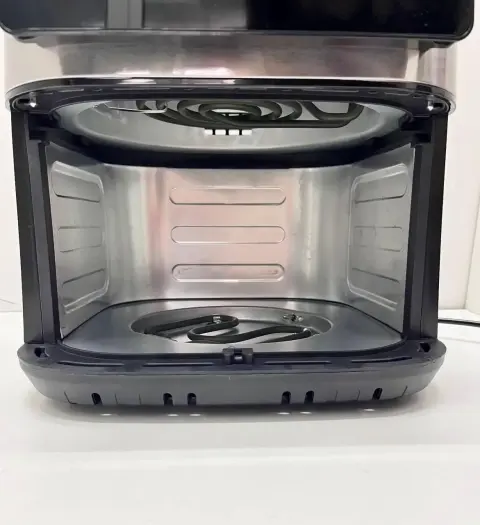 Аерофрітюрниця оснащена інноваційною технологією циркуляції гарячого повітря на 360 °, що рівномірно прогріває продукти з усіх боків. Додаткова технологія лійкоподібного тепла спрямовує нагрів знизу, що особливо ефективно для запікання м'яса, овочів та випічки. Подвійні нагрівальні елементи (верхня та нижня тіні) гарантують рівномірне приготування без пересушування.