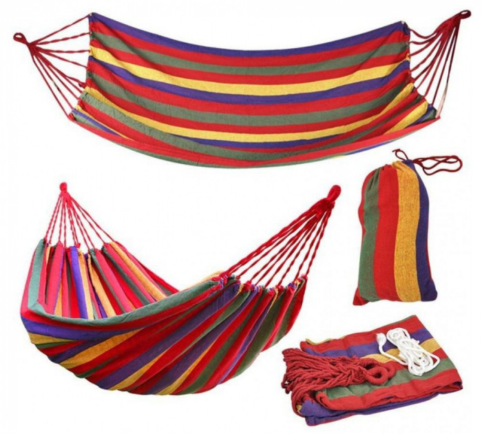 Гамак подарує Вам комфортний відпочинок на природі. Він виконаний з високоміцної бавовни і здатний витримувати навантаження до 120 кілограм. Дана модель гамака виконана без планки, він легкий і компактний, поставляється в бавовняному мішечку-чохлі. Такий гамак можна взяти з собою в похід - у складеному вигляді він займає дуже мало місця.