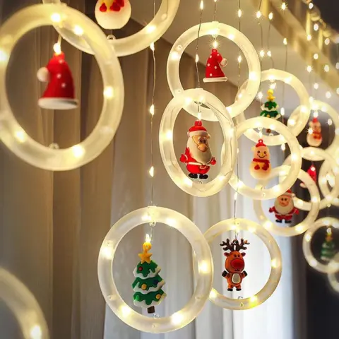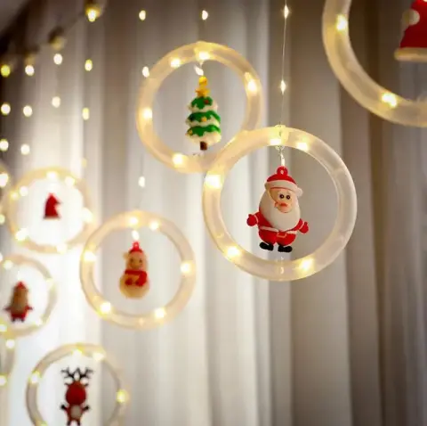 Новорічна світлодіодна гірлянда виконана у вигляді великих кілець з різним наповненням (Дід Мороз, Сніговик, Олень, Ялинка та ін.). У кожному з кілець кілька світлодіодів, які створюють святкову атмосферу та наповнюють будинок новорічним настроєм.