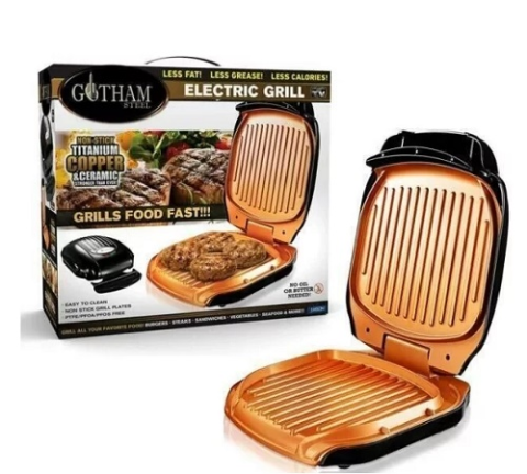 Електрогриль Gotham Steel робить здорову їжу з низьким вмістом жиру вдвічі швидше, ніж звичайні грилі. Ви можете приготувати гамбургери за п'ять хвилин, а смачні бутерброди Паніні – за дві. Цей гриль оснащений нагрівальними елементами згори та знизу для одночасного приготування обох сторін. Все мастило та інші шкідливі для здоров'я рідини стікають у зручну пастку для жиру. Антипригарна поверхня гриля зберігає неушкоджені продукти і легко миється після використання, просто витираючи жир та жир паперовим рушником.