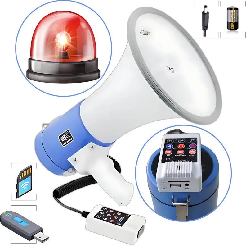 Мегафон має вбудовану сирену та USB порт. Є дві гучності та функція запису до 15 секунд.