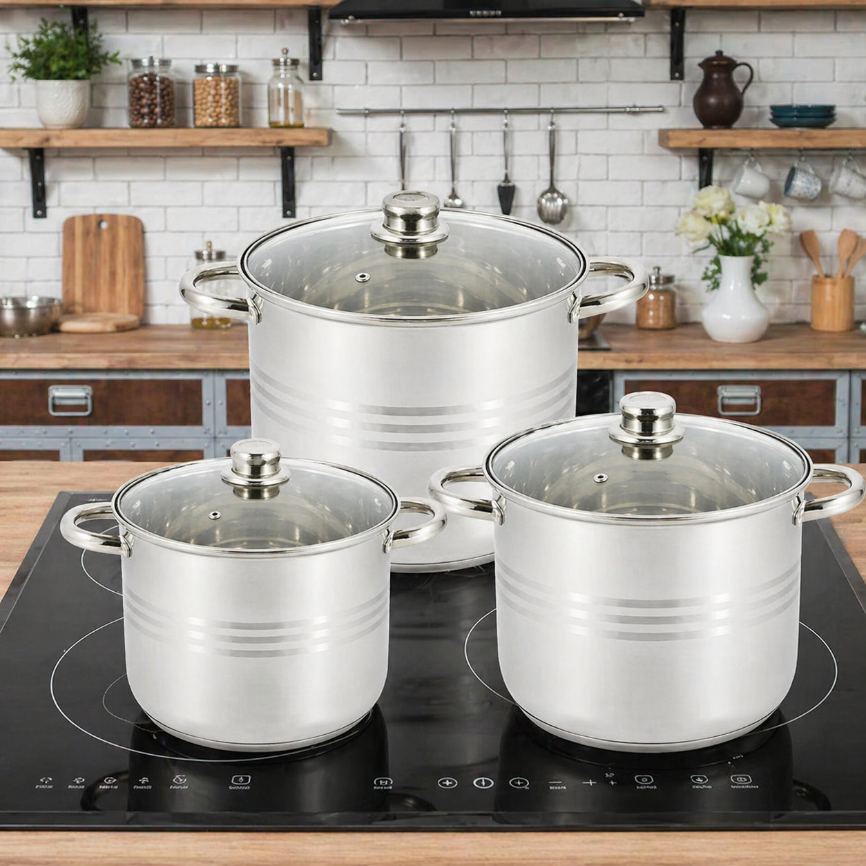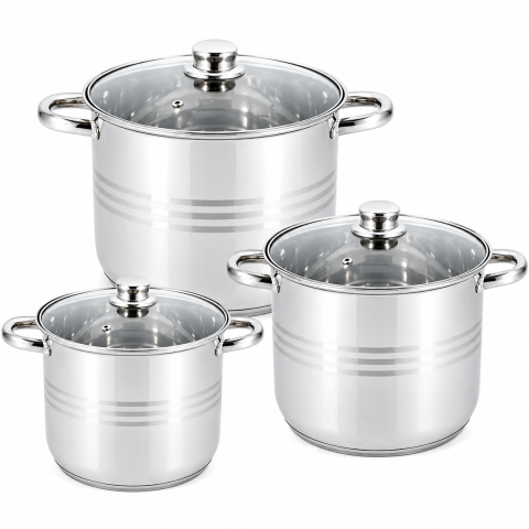 Каструлі мають термостійкі клепані ручки, що не нагріваються. Кришки виготовлені з жароміцного скла з отвором для виходу пари.
