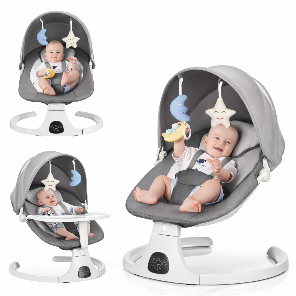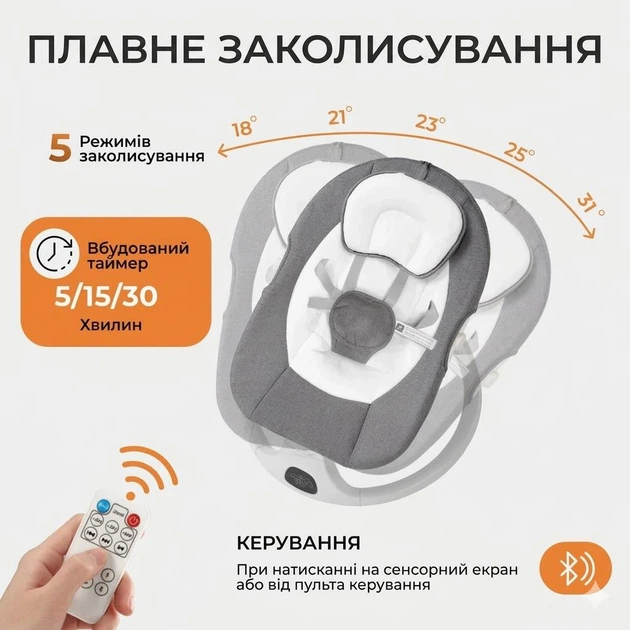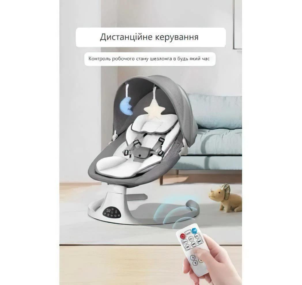 Щоб малюк швидше розслабився і заснув, передбачено 5 швидкостей заколисування та 12 приємних мелодій із регулюванням гучності. За допомогою APP-програми для смартфона можна керувати центром. Виберіть комфортний режим заколисування, встановивши таймер на 8, 15 або 30 хвилин, а "розумний" сенсор сам визначить, коли малюк заснув, і плавно зупинить гойдання. Як тільки дитина прокинеться, гойдалка знову почне рух. А з пультом дистанційного керування стане ще простіше – налаштовуйте режими, не підводячись з місця.