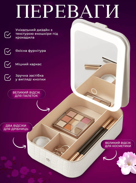 Ця стильна та функціональна косметичка призначена для зручного зберігання косметичних засобів та комфортного нанесення макіяжу в будь-яких умовах. Завдяки вбудованому дзеркалу з підсвічуванням та продуманою організацією простору всі необхідні кошти будуть під рукою як удома, так і в дорозі.