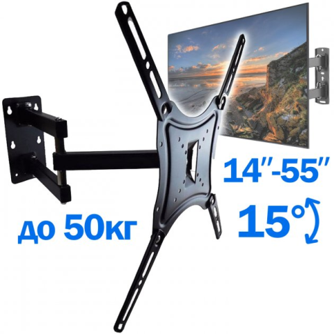 Кронштейн для кріплення телевізора на стіну дозволяє встановити телевізор або монітор з діагоналлю від 14" до 55" дюймів у зручному для вас положенні. Кронштейн повністю відповідає стандарту VESA, що дозволяє встановити телевізор/монітор зі стандартним кріпленням 50×50, 75×75, 100×100, 100×200 або 200×200 мм. У комплекті із кронштейном є всі необхідні інструменти для монтажу. Цей кронштейн передбачає можливість повороту телевізора по вертикалі в межах +/-15 градусів, що неймовірно зручно при використанні. Тепер перегляд стане ще зручнішим.