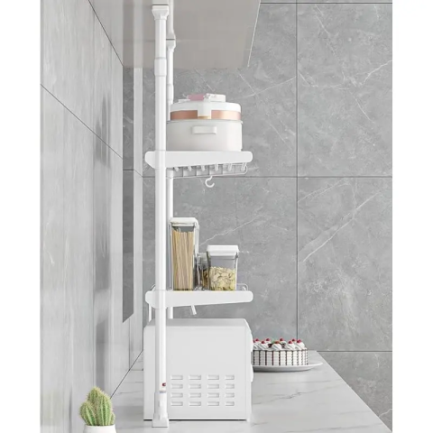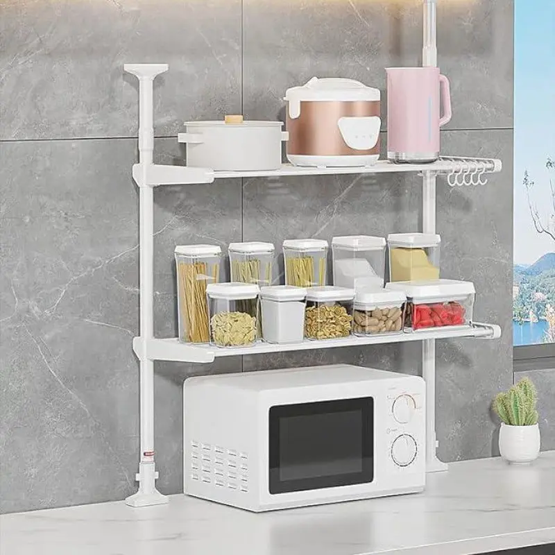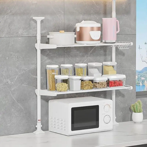 Телескопічна полиця-органайзер – ефективне рішення для економії місця на кухні. Завдяки розсувній конструкції цей стелаж зручно встановлюється над мікрохвильовою піччю, духовкою або кавоваркою, надаючи додаткові місця для зберігання спецій, посуду та кухонних приладів.