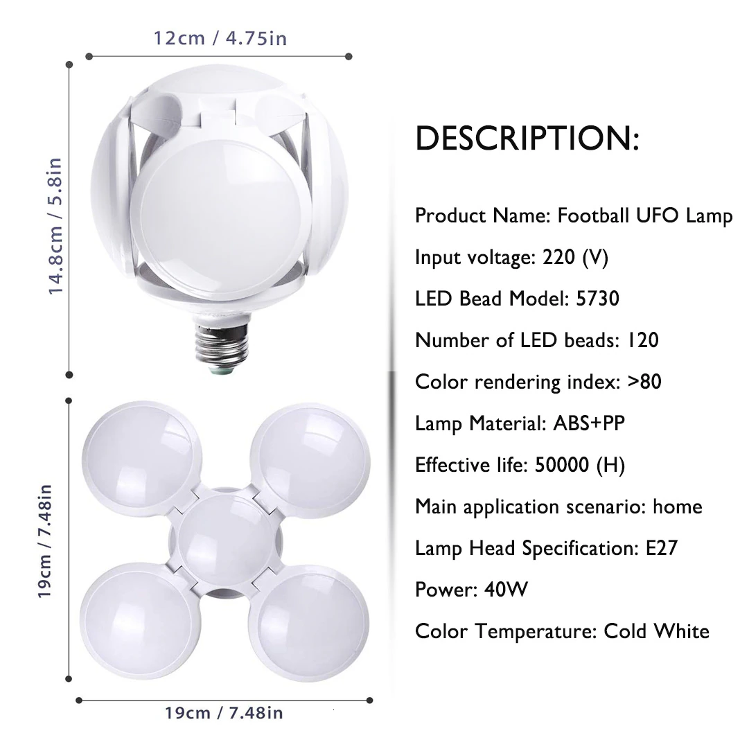 Складаний світильник LED Football UFO Lamp E27 - креативна лампа з новим легким дизайном округлої форми, призначений для освітлення різних інтер'єрів вашого будинку, можна використовувати в майстернях і гаражах. Вона відрізняється низьким енергоспоживанням, але має дуже гарну яскравість. Це важливі фактори, щоб купити розкладну лампу люстру собі додому.