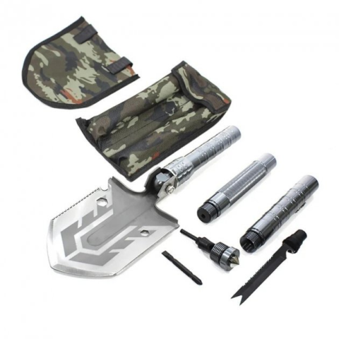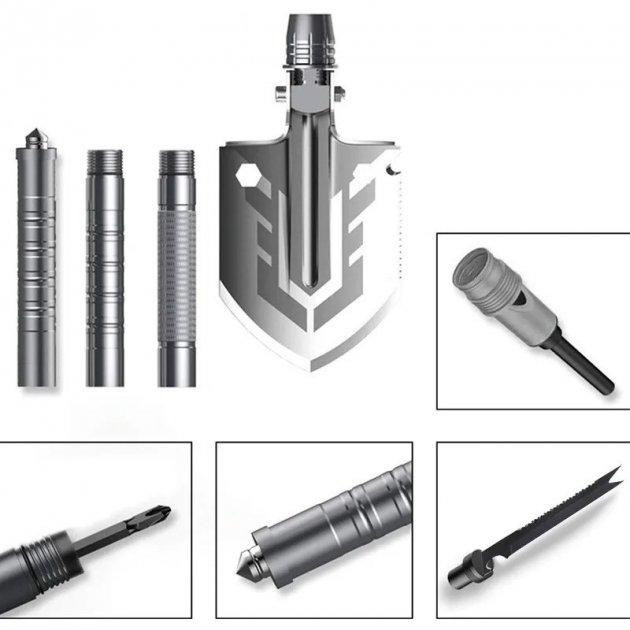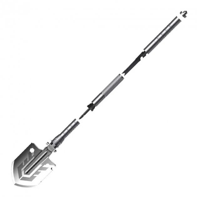 Всі ці якості має складна мультифункціональна туристична лопата 16-в-1. Що вона є? Виготовлена з металу, у зібраному стані має вигляд звичайної лопатки із довгою ручкою. Складається з 8 невеликих частин, у тому числі з 3-х основних.
