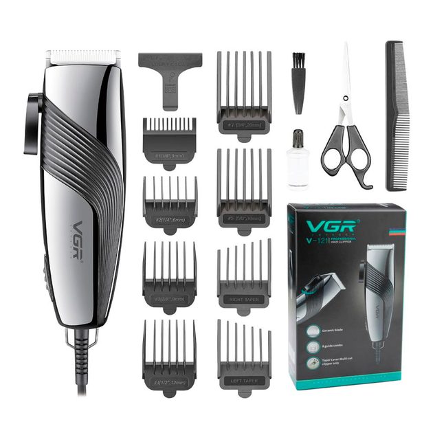 Машинка для стрижки волосся та бороди VGR Professional V-121, 8 насадок, ножиці, гребінець, від мережі 220