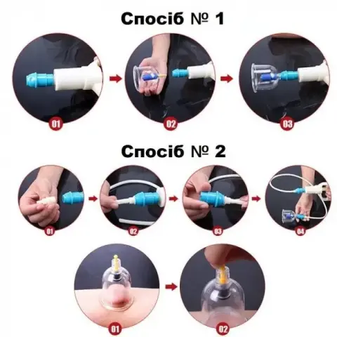 Горловину банки потрібно щільно встановити на шкіру та приєднаним насосом відкачати повітря з банки, звичайним рухом руки.