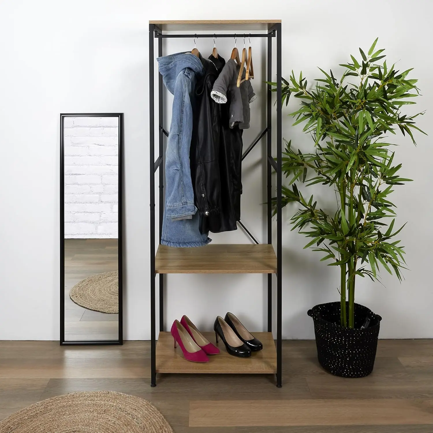 2 полиці дозволяють використовувати нижню частину шафи для взуття та ящиків для зберігання. Також можна розмістити декоративні елементи, такі як фоторамки або рослини у невеликих горщиках.