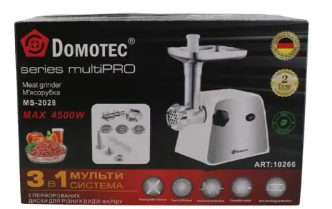 М'ясорубка 3в1 DOMOTEC MS-2028 4500W - це універсальний кухонний прилад, що поєднує функції м'ясорубки, соковижималки та овочерізки.