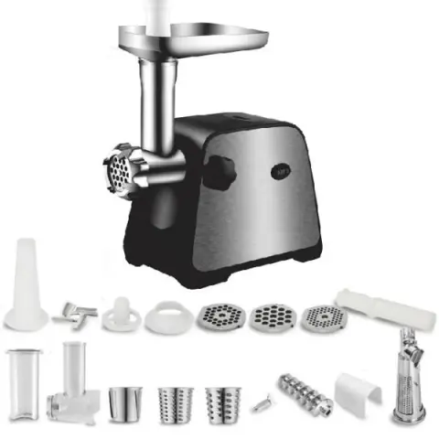 У комплект входять металеві грати (3 шт.), насадки для кеббе та ковбас, соковитискач для томатів та цитрусових, а також 3 терки/шатківниці.